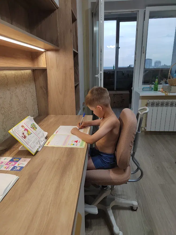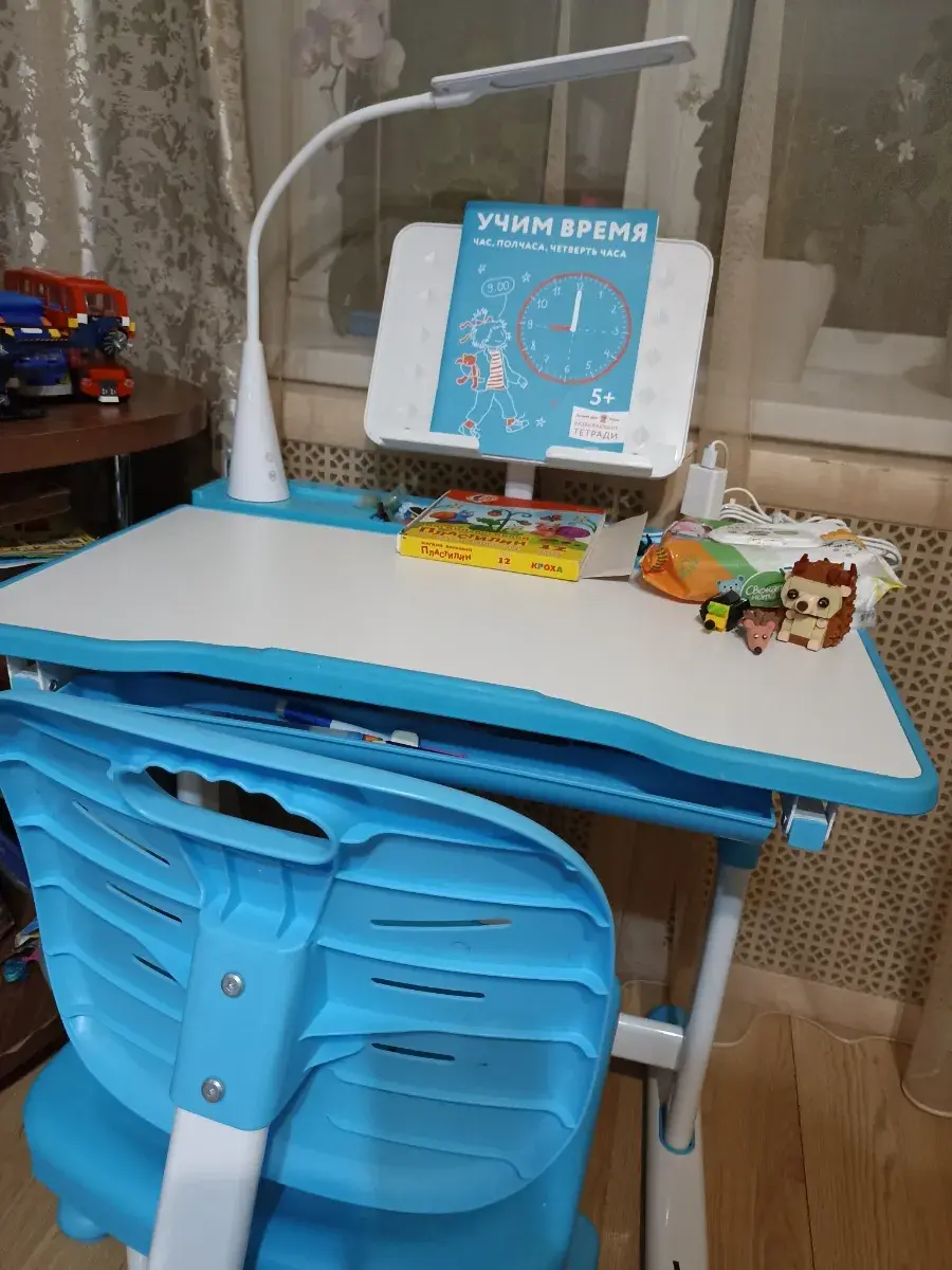 В целом партой и стулом довольны. Качественные материалы, без запаха, простота сборки и использования, запасные чехлы, удобная ручка для передвижения стула. Сын активный, на месте не сидит, а если и сидит то криво. На новом стуле он сидит ровнее. Будем надеятся, что на 3-5 лет данного комплекта хватит.
