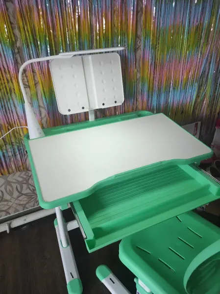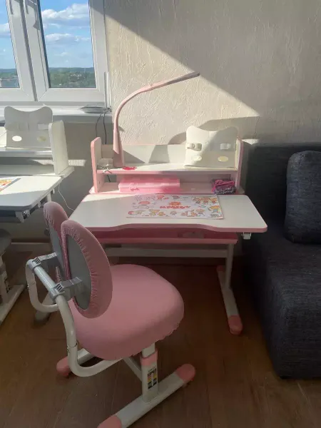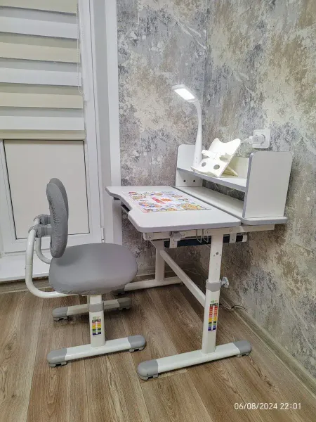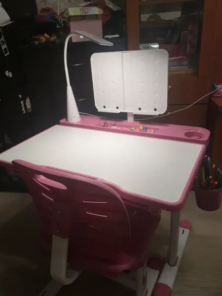 Парта и стул идеальны для младших классов. Удобная регулировка по росту ребенка до 155 см., регулируемый наклон столешницы, полочки для книг и выдвижной ящик для канцтоваров, лампа с несколькими режимами освещения, а также в комплекте подставка для книг, съёмные чехлы для стула и пластиковый коврик для творчества. В общем наш будущий первоклассник был в восторге от подарка.