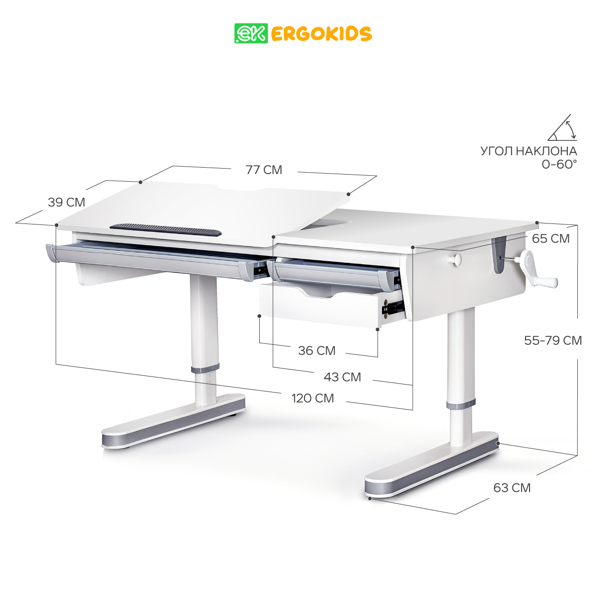 Столешница разделена на две части. Подвижная часть может изменять угол наклона до 60 градусов с помощью газлифта. Это удобно для выполнения домашних заданий и работы за столом, будь то школьные уроки, учеба, развивающие занятия с игрушками Mонтессори или рисование кисточками, занятия творчеством.