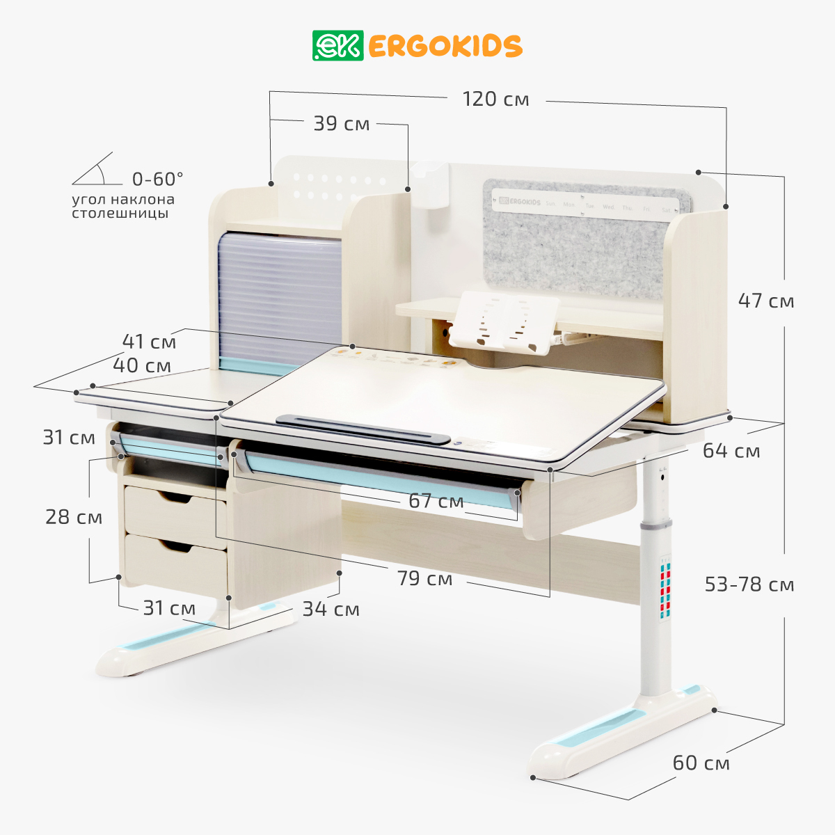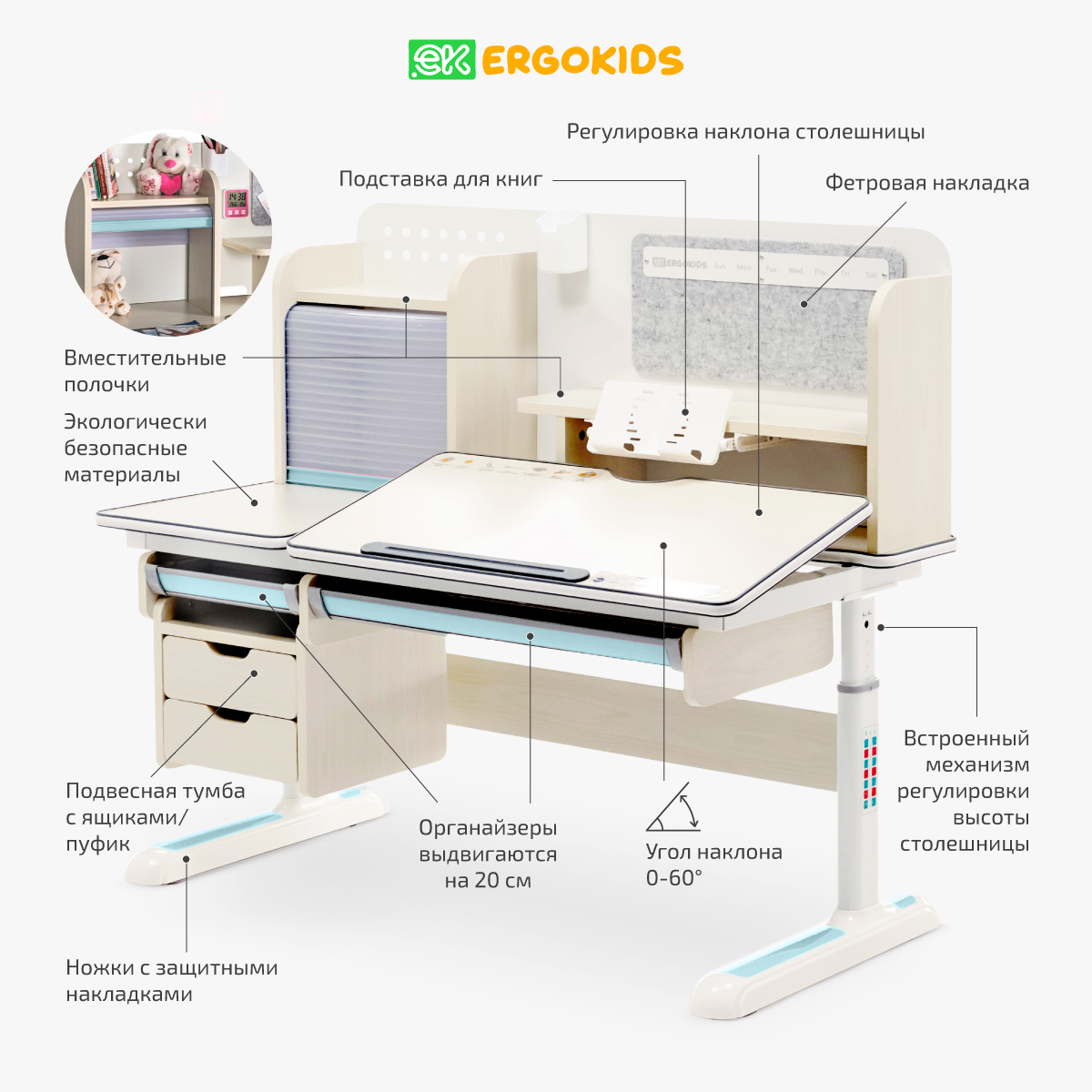 Детский письменный стол для школьника Ergokids Winnipeg Multicolor - это ортопедическая мебель, которая заботится о здоровье и осанке вашего ребенка. Стол рассчитан на детей в возрасте от 5 лет.